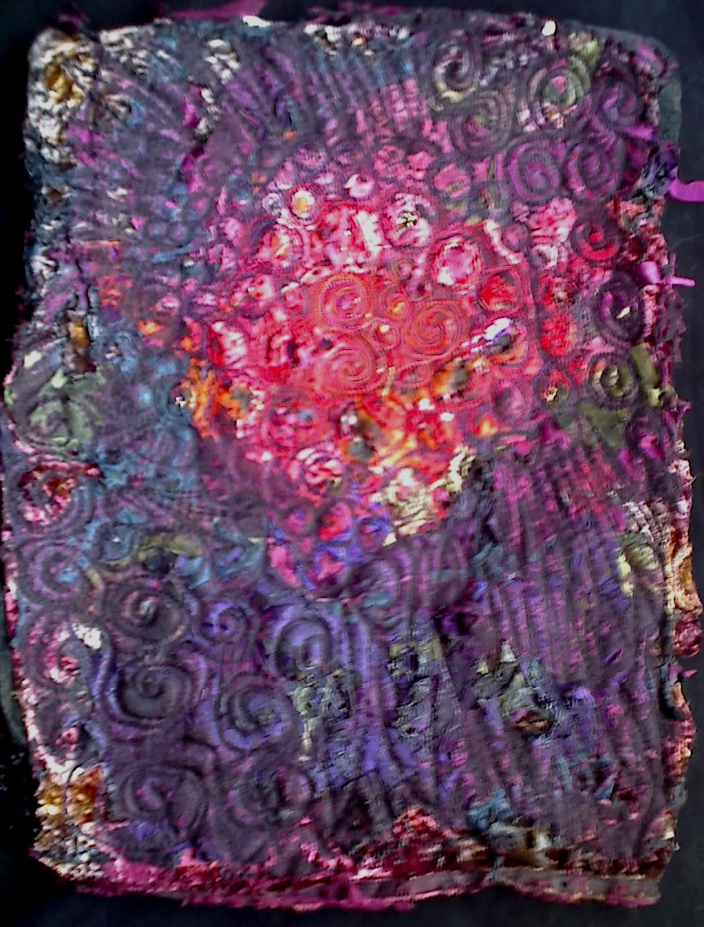 wool/hemp; silk organza; hemp linen and plastic transparency. stitched, then sprayed with ink and finger painted with red and turquoise fabric paint.